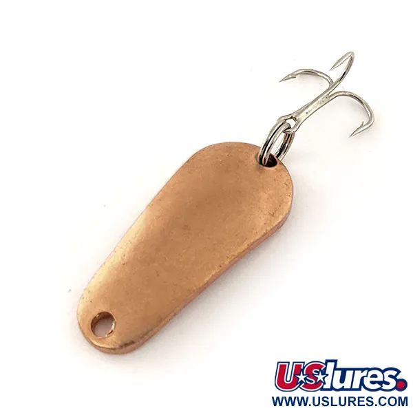 Stämplat direkt i den konkava metallytan särskiljer namnet "Aero" och viktmarkeringen 1/4 oz (7 g) detta vintage-skeddrag från USA. Kroppen mäter 1 1/2" (3,7 cm) och har en rik kopparfinish som förblir blank och tydlig, vilket återspeglar ett skick på 5/5. Producerat av Aeroplane Spinner Co. i USA, är betet byggt med en robust silverfärgad trekrok säkrad med en fjäderring baktill. Ett precisionsstansat hål i den smala änden möjliggör direkt knut på linan eller montering av en tafs. Identifierat med produktkod 12052, är skeddragets solida konstruktion skräddarsydd för traditionella kast- eller trollingtekniker.