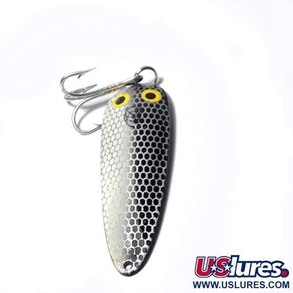 Med en vikt på 28 g (1 oz) är detta massiva skeddrag ett klassiskt exempel på amerikansk fiskehistoria. Den 9 cm (3 1/2") långa kroppen har en silverfinish med ett svart honungskaksmönster och två distinkta gula ögon, känt som färgsättningen Natural. På baksidan identifierar den djupa präglingen "DARDEVLE DETROIT USA" att draget tillverkades av Eppinger före deras flytt till Dearborn 1959. Detta exemplar, med produktkod 0243, är i skick 5/5 och uppvisar den specifika konkava formen som skapats med tillverkarens egna pressverktyg. Komponenterna består av en robust trekrok säkrad med en kraftig fjäderring. Denna kraftiga metallkonstruktion är utformad för att underlätta långdistanskast och låta betet bibehålla sitt djup vid jämn invevning, där det producerar en konsekvent vinglande gång.