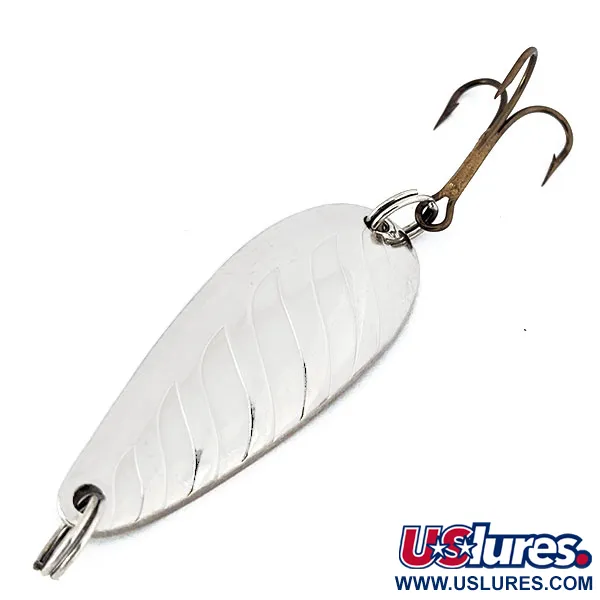 Vågformade, vertikala räfflor över den polerade silverytan skapar ett distinkt ljusreflekterande mönster på detta vintage-skeddrag av metall. Med en längd på 4,5 cm och en vikt på 11 g exemplifierar betet det klassiska hantverk som förknippas med namnet Abu Garcia. Baksidan är tydligt stämplad med Garcia-logotypen och modellnamnet Sierra Spoon, vilket ger ett tydligt bevis på dess ursprung. Utrustad med en mörkfärgad trekrok och fjäderringar i båda ändar, förblir hårdvaran stark och funktionell. Detta specifika exemplar, identifierat med produktkod 16432, har ett skickbetyg på 5/5 och uppvisar en anmärkningsvärt ren och blank utsida.