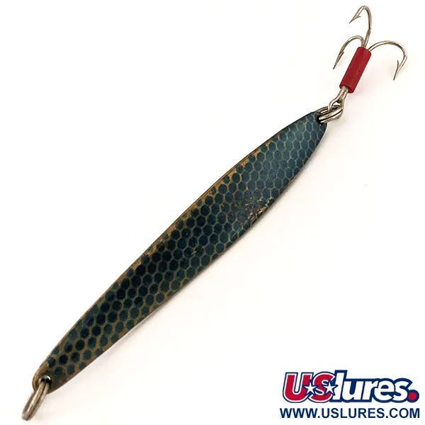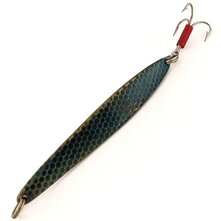 En vikt på 31 g (1 oz) ger den densitet som krävs för att nå djupa strukturer eller bryta igenom vinden under ett långt kast. Denna Johnson Lujon, katalogiserad under produktkod 13032, visar ett slående blått bikupemönster som ger visuell textur till den 9 cm (3 1/2") långa kroppen. Den metalliska finishen är exceptionellt välbevarad, och föremålet har ett skick på 5/5, redo för en monter eller en dragväska. En röd plasthylsa vid basen av trekroken fungerar som en klassisk visuell attraktion och huggpunkt för fisk. Den långsträckta profilen och den lätta kölen på buken är karakteristiska för amerikanska metalldrag från mitten av århundradet avsedda för jigging eller kastfiske. Båda ändarna är försedda med robusta fjäderringar, vilket säkerställer säkra anslutningar till ditt tafsmaterial och krok. Tillverkad i USA, speglar detta exemplar de hållbara konstruktionstekniker som etablerade Johnson som ett välkänt namn inom vertikalt jigging-fiske.