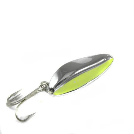 En livlig fluorescerande grön rand löper längs sidan av detta förnicklade skeddrag och skapar en profil med hög visuell kontrast. Med en vikt på 7,5 g (1/4 oz) är TODDCO Main Liner ett kompakt drag på 4 cm (1 1/2") designat för mångsidigt spinnfiske. Detta USA-tillverkade exemplar, katalogiserat under produktkod 0430, har en polerad nickelfinish som reflekterar ljuset effektivt från olika vinklar. Utrustningen inkluderar en robust fjäderring som fäster en trekrok på baksidan av den droppformade kroppen. Draget är i nyskick (5/5) och framstår som oanvänt, där den chartreuse-färgade färgen förblir distinkt mot den blanka metallytan. Stämplingen på baksidan bekräftar dess ursprung i USA, helt i linje med varumärket TODDCO:s arv.