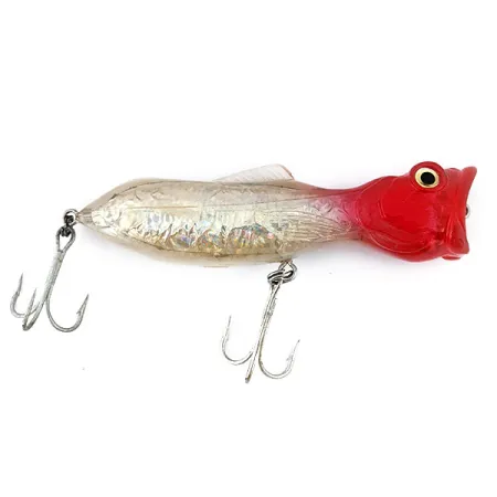 Med en rejäl vikt på 75 g (2 3/4 oz) är denna tungviktare en Matzuo Captain Hook i sjunkande utförande, identifierad med produktkod 16677. Kroppen på 15 cm (6") har ett klassiskt högkontrasterande Red Head-mönster som övergår i en genomskinlig mittsektion med silverflarn och en strukturerad invändig finish. Denna specifika finish är utformad för att reflektera ljus i olika vinklar vid spinnfiske eller trolling efter lax, gädda eller gös. Som en sjunkande variant arbetar betet på ett variabelt djup, vilket möjliggör exakt placering i vattenpelaren beroende på invevningshastigheten. Matzuo America-logotypen är tydligt synlig i guldskrift på sidan, vilket speglar varumärkets närvaro på den amerikanska marknaden. Både trekrokar och fjäderringar är i utmärkt skick, motsvarande betyg 5/5. Den skålade fronten är ett karaktäristiskt drag för Captain Hook-serien, här kombinerat med en robust konstruktion avsedd för stora rovfiskar i både söt- och saltvatten.