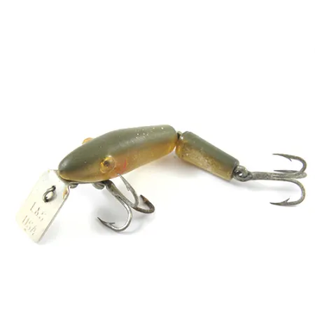 Tydligt präglat på dykskeden av metall finns det klassiska märket "L&S USA", som identifierar detta bete som en autentisk produktion från L&S Bait Company. Detta MirrOlure Bass-master-exemplar har en ledad kroppskonstruktion, i en subtil Golden Natural-färgskala som övergår från en olivtonad rygg till en varm, genomskinlig undersida. Med en storlek på 1 1/2" (4 cm) och en vikt på 1/16 oz (2 g) är betet ett kompakt verktyg för kastfiske. Under produktkod 2747 behåller betet sin originalhårdvara, inklusive två bukmonterade trekrokar och den karakteristiska metallskeden. Skicket är graderat till 4/5, då finishen och den strukturella integriteten är solid över båda kroppssegmenten.