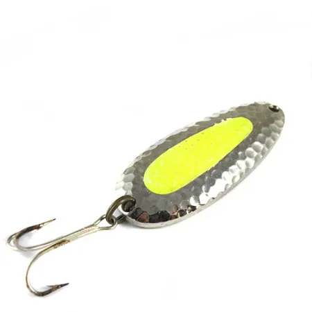 En kraftig hamrad nickelfinish ger detta skeddrag på 28 g (1 oz) en tydlig reflekterande yta som fångar ljuset även i djupt eller grumligt vatten. Denna Nebco Pixee, identifierad med produktkod 0510, har den karakteristiska neongula laxromsimiteringen, ett avgörande designelement från National Expert Bait Co.-eran innan märket övergick till Blue Fox. Draget mäter 6,4 cm (2 1/2") på längden och den kraftiga mässingskonstruktionen ger den massa som krävs för att nå djupa höljor i älven eller för långa kast mot kustvindar. Baksidan är stämplad med namnet Nebco PIXEE och patentinformation, även om just detta exemplar är märkt 7/8 oz trots att det väger hela 28 g (1 oz) enligt katalogspecifikationerna. Betygsatt 4/5, visar betet lätt ytligt slitage på nickelpläteringen och mindre missfärgning på den ursprungliga trekroken. Den är konstruerad för en mängd olika tekniker, från jämn hemtagning i saltvatten till en tumlande presentation i strömhål för steelhead och lax. Den gula insatsen fungerar som en visuell huggpunkt som imiterar rom, vilket gör den till ett basredskap för örings- och laxfiskare.