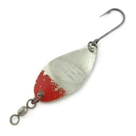 De amerikanska och kanadensiska patentmarkeringarna är tydligt präglade i nickelytan och ger en direkt koppling till mitten av 1900-talets redskapsdesign hos detta Shoff's F.S.T.2. Detta USA-tillverkade skeddrag väger 5,5 g (3/16 oz) och mäter 4,5 cm (1 3/4"), ett klassiskt exempel på fiskearvet från nordvästra Stillahavskusten. Färgsättningen i nickel/rött har en tydlig röd målning på den främre delen, med lätta ytmärken som överensstämmer med skicket 5/5. Hårdvaran är intakt och funktionell, utrustad med ett smidigt lekande och en enkelkrok bakåt. Draget bär produktkod 23904 och dess metallkropp har kvar sin ursprungliga lyster, vilket gör det till en fin representant för Shoff's specialiserade skeddrag för spinnfiske och trolling.