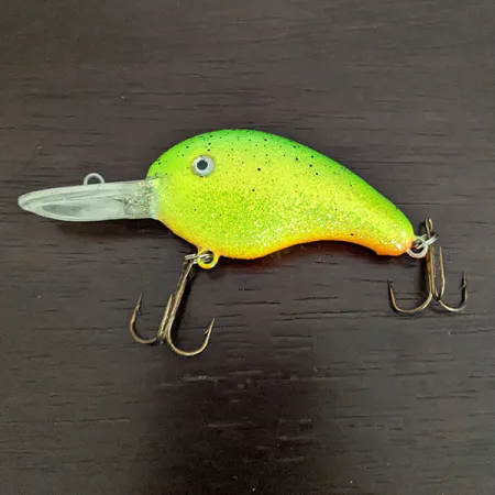 Detta bete glittrar i ljuset, och den glitterfyllda neonfinishen i grönt och gult ger det en hög synlighet i vattenpelaren. Denna Strike King 4XD med produktkod 16418 är 5 cm lång och väger 10 g, vilket gör den till ett gediget val för både spinnfiske och trolling. Den långa, transparenta hakskeden är konstruerad för att nå fiskedjup på 2,4–3,6 meter, särskilt framtagen för att rikta in sig på gös och gädda som står vid djupare strukturer. En intern rasselkammare bidrar med ett rytmiskt ljud till dess presentation. Just detta exemplar bär spår av användning med ett skickbetyg på 3/5, vilket innefattar en del ytliga märken och originaltrekrokar som visar ålder men som är fullt funktionella. Övergången från den skarpa chartreuseryggen till den dämpade orangea buken återspeglar den klassiska färgpalett som Strike King är känt för.