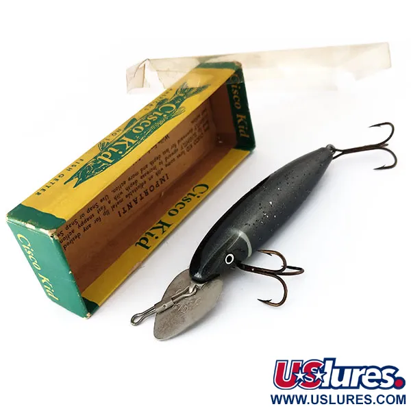 Med en vikt på 1/2 oz (14 g) kännetecknas den djupgående profilen hos detta vintageexemplar av sin överdimensionerade, justerbara dyksked i metall. En total längd på 9,5 cm gör Wallsten Tackle Cisco Kid till ett rejält val för tungt fiske efter gädda och muskie. Denna wobbler, med produktkod 10173, har en djupsvart finish prydd med silverskimmer och ett distinkt vitt band runt nacken. Exemplaret är oanvänt och förvaras i originalförpackningen i gult och grönt med genomskinligt plastlock. Den justerbara metallskeden är ett signum för Cisco Kid-serien, designad för att trimmas av fiskaren för att nå specifika djup beroende på vattenförhållandena. Enligt instruktionerna på originalförpackningen möjliggör dessa manuella justeringar exakt djupkontroll vid trolling eller spinnfiske. De målade ögonen i vitt med svarta pupiller står i skarp kontrast till den mörka, skimrande kroppen.