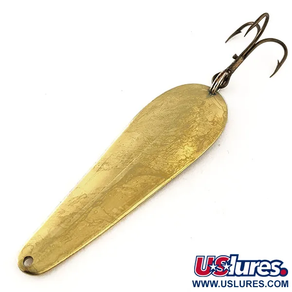 Med en vikt på 11 g (2/5 oz) är detta skeddrag i mässing ett klassiskt stycke amerikansk fiskehistoria från Wright & McGill. Med en längd på 6 cm (2 1/4") är droppprofilen stämplad på undersidan med tillverkarens märke och modellnamnet. Mässingsytan har underhållits väl och behåller en blank yta över sin konkava form. Vid stjärten sitter en vintage trekrok säkrad med en robust fjäderring, redo för fiske eller samlarhyllan. Katalogiserad under produktkod 11530, är detta exemplar i 4/5 skick med mindre ytmärken som visar att det varit en del av en aktiv fiskesamling. Detta bete speglar den era då Wright & McGill överförde sin expertis från högkvalitativa krokar till ett bredare sortiment av framgångsrika metallbeten.