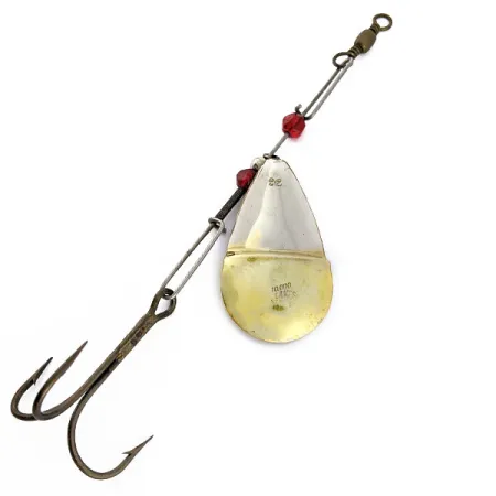 Denna vintage-spinnare är en klassisk 10000 Lakes 92-modell och mäter 14 cm (5 1/2") från det övre lekandet till trekrokens spets. Det droppformade skedbladet har en distinkt tvåtonad finish i nickel och guld, med ett tydligt inslag av röd färg på baksidan. Röda facetterade pärlor är trädda på trådkonstruktionen, vilket ger visuell kontrast och fungerar som distanser för de roterande komponenterna. Med en vikt på 1/2 oz (14 g) är detta bete viktat för effektivt kastfiske eller trolling och är byggt kring en hållbar genomgående ståltråd. Det tillverkades i USA och bär produktkod 18910. Skedbladet är stämplat med modellnamnet, vilket bekräftar dess ursprung. Skicket är bedömt till 4/5, vilket innebär minimalt slitage samtidigt som dess ursprungliga lyster och strukturella integritet har bevarats.