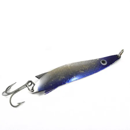 Detta svensktillverkade skeddrag väger exakt 18g (2/3oz) och har den distinkta Nickel / Blå-finishen som samlare genast känner igen. Den 9cm (3 1/2") långa kroppen på detta Abu Toby, med produktkod 0961, har en djupt blå ton längs ytterkanterna som ramar in ett texturerat silvercentrum som efterliknar fjällmönstret hos en betesfisk. Ett enstaka svartvitt öga är placerat nära huvudet, medan undersidan har en ren, förnicklad yta, stämplad med Abu Garcias varumärke och ursprunget Sverige. Just detta exemplar har de karakteristiska små fenorna vid stjärten och är utrustat med en robust trekrok säkrad med en fjäderring. Överlag är draget i 4/5-skick, med mycket lätta spår av ålder men med bibehållen lyster i finishen.