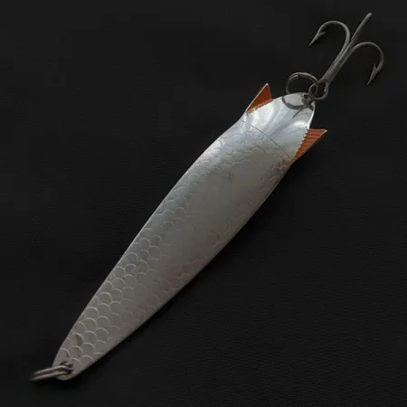 Silvrigt fjällmönster djupt präglat i kroppen ger den klassiska visuella dragningskraften hos denna svensktillverkade legend. Med en längd på 9 cm och en vikt på 18 g har detta exemplar de ikoniska fenorna i bakänden, med den karakteristiska orangea färgen på undersidan för en extra färgklick. Tydligt stämplad på den konkava baksidan finns "ABU SWEDEN"-märkningen tillsammans med namnet, vilket intygar dess ursprung som ett genuint skandinaviskt hantverk. Detta drag, med produktkod 21100, är i skick 5/5 med en blank, ren finish och originalkomponenter rakt igenom. Trekroken sitter säkert fäst med en kraftig fjäderring, redo för både spinnfiske och trolling i olika vatten.