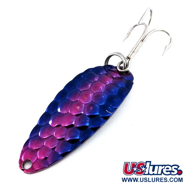 Detta amerikansktillverkade skeddrag väger 9g (1/3oz) och har en tydlig bred profil utformad för kastfiske. Framsidan har ett hexagonalt fjällmönster i en gradient av lila och djupblått, medan baksidan är i ren, polerad nickel. Med en längd på 4,5 cm (1 3/4") är denna Acme Little Cleo katalogiserad under produktkod 10271 och levereras i ett felfritt 5/5-skick. Detaljerna inkluderar en fabriksmonterad fjäderring och en vass trekrok, båda utan spår av ålder. Den stansade stålkonstruktionen är försedd med ett linhål i den smala änden och ett krokfäste i den bredare bakänden. Det stansade hålet i framkanten är fint finishat för direkt anslutning till lina eller lekande.
