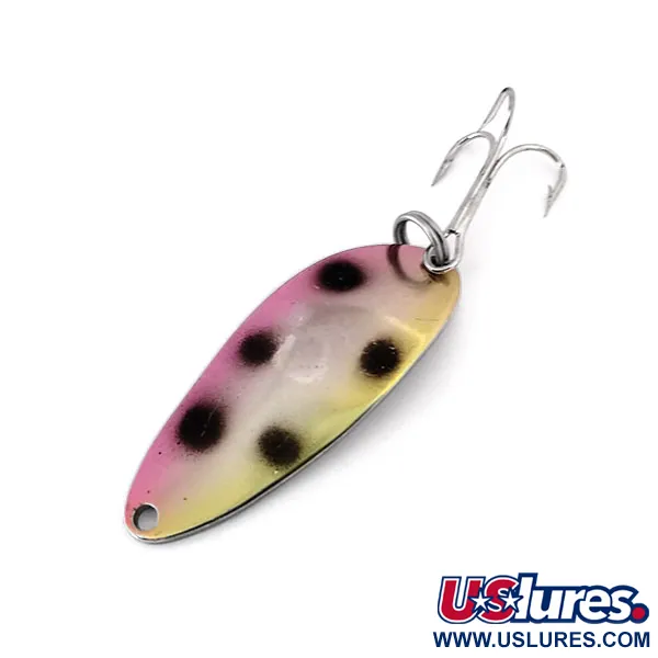 Inpräglat i den förnicklade baksidan anger viktmarkeringen på 1/3 oz (9 g) specifikationerna för detta skeddrag. Detta exemplar, identifierat med produktkod 10299, är en sällsynt övergångsmodell från perioden omedelbart efter Acmes förvärv av varumärket, utmärkt av "WIGL LURE"-stämplen bredvid det klassiska namnet. Framsidan visar ett livfullt Trout / Nickel-mönster med en rosa och gul gradient med tydliga svarta prickar över den 1 3/4" (4,5 cm) långa kroppen. En trekrok är säkrad med en robust fjäderring, och nosen är rent stansad för fäste av tafs eller lekande. Tillverkad i USA, bibehåller metallen en briljant lyster och färgen är skarp, vilket motsvarar ett skick på 5/5. Den kraftiga konstruktionen ger hög densitet för kast i djupt vatten eller trolling.