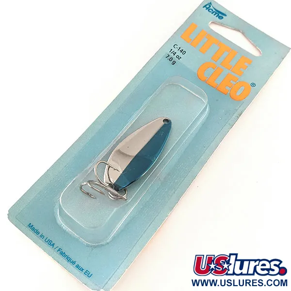 Detta amerikansktillverkade skeddrag mäter 4 cm (1 1/2") längs sin böjda metallkropp och har den traditionella tvåfärgade designen för hög visuell kontrast. Finishen är i krispig Nickel / Blå, applicerad på den karaktäristiska puckelformen som definierar Acme Little Cleo-serien. Betet är katalogiserat under produktkod 11346 (tillverkarens stil C-140/NNB) och levereras i sin originalförpackning (blister). Detta exemplar är i skick 6, vilket innebär att det är oanvänt och har kvar sin fabriksglans på både pläteringen och trekroken. Med en vikt på 7 g (1/4 oz) är skeddraget konstruerat för hög kastprecision och har den klassiska stämplade logotypen vid huvudet. Baksidan av förpackningen har tvåspråkig text som speglar dess historiska popularitet bland nordamerikanska sportfiskare i över fem decennier.