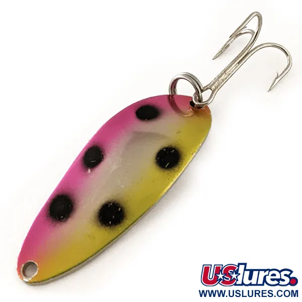 Detta Acme Little Cleo skeddrag på 9 g (1/3 oz) är stämplat med beteckningen "WIGL LURE" på baksidan och representerar en klassisk era av amerikansk sportfisketillverkning. Framsidan har ett livfullt Rainbow Trout-mönster (regnbåge), där en kraftig rosa kant övergår i ett vitt centrum och en guldfärgad buk, prydd med sex exakt placerade svarta prickar. Draget är 4,5 cm (1 3/4") långt och dess tydligt böjda profil är konstruerad för stabilitet vid både kast och trolling. Just detta exemplar, med produktkod 11689, är i nyskick (5/5) med en ren, reflekterande krombaksida och oklanderlig finish. Originalhårdvaran, inklusive den övre fjäderringen och trekroken, är intakt och blank. "LITTLE CLEO"-stämpeln är djup och tydlig, vilket intygar dragets äkthet.