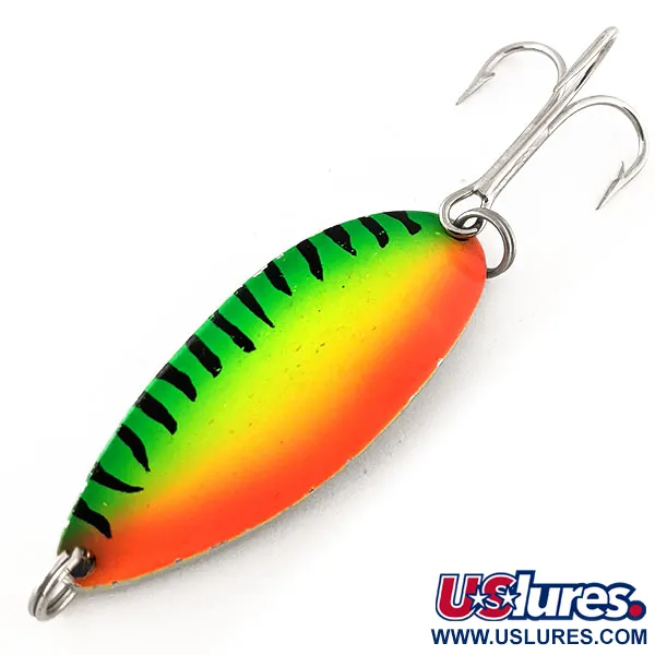 Tydligt instämplat i den polerade silverbaksidan bekräftar märkningarna "LITTLE CLEO" och "3/4 OZ." (21 g) identiteten på denna amerikansktillverkade klassiker. Med en längd på 6,5 cm (2 1/2") har detta exemplar en levande Fire Tiger-finish med kraftiga svarta ränder över en gradient från grönt till gult till orange. Den tjocka metallkonstruktionen och den karakteristiska puckelformen är kännetecken för Acme Tackle Companys design, vilket hjälper draget att behålla sin position i vattenpelaren vid jämn invevning. Detta specifika exemplar, identifierat med produktkod 11849, är i 5/5-skick, med en ren yta och en vass trekrok fäst via en robust fjäderring. Den kraftiga pläteringen på insidan ger en ljus blixt som kontrasterar mot den högvisibla målade utsidan. Konstruerad för både spinnfiske och trolling, underlättar viktfördelningen på detta 21 g (3/4 oz) skeddrag långa kast även i motvind.