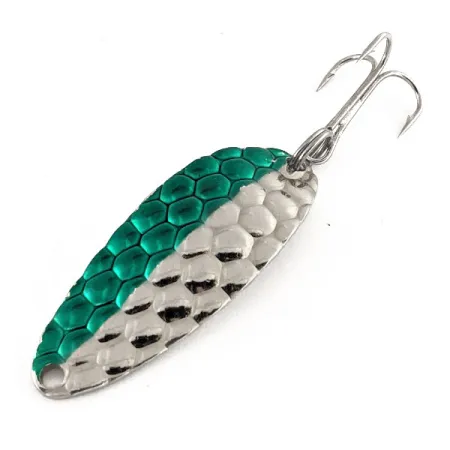 Gröna och nickelfärgade fjäll skapar ett distinkt bikupemönster på den konvexa ytan på denna klassiska Acme Little Cleo. Med en vikt på 9g (1/3oz) och ett mått på 4,5cm (1 3/4"), förblir detta USA-tillverkade skeddrag en stapelvara för sportfiskare som jagar öring, lax eller gös. Den livfulla gröna finishen täcker exakt hälften av den hamrade texturen, vilket gör att den polerade nickelytan kan blinka och reflektera ljus från den intilliggande sidan. Detta specifika exemplar, katalogiserat under produktkod 12399, uppvisar den klassiska puckelprofilen som skiljer Cleo från tunnare skeddrag. På baksidan är den släta, polerade nickelytan ren, vilket ger ett utseende med hög kontrast när draget är i rörelse. Maskinvaran består av en vass, silverfärgad trekrok säkrad med en kraftig fjäderring vid stjärten. Draget är i utmärkt skick med betyget 5/5, och färgen är intakt över de texturerade bikupeformade fördjupningarna. Detta bete är ett bevis på Acmes tillverkningsarv i USA, med en stansad linjefästning i den smala änden för säker tackling.