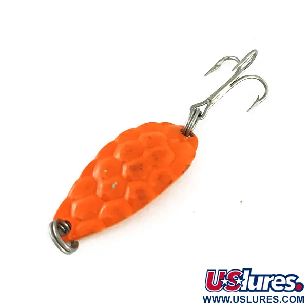 Det bikakemönstrade ytskiktet på den konvexa sidan av detta orangea skeddrag hjälper till att sprida ljuset även i grumliga förhållanden. Med en längd på 3 cm (1 1/4") och en vikt på 3,5 g (1/8 oz) är Acme Little Cleo ett klassiskt amerikansktillverkat spinnbete som har förtjänat sin plats i den amerikanska sportfiskehistorien. Detta specifika exemplar, med produktkod 9493, har en enhetlig orange finish på både den mönstrade framsidan och den släta konfava baksidan. Det är utrustat med en vass trekrok och dubbla fjäderringar för att underlätta montering och rörelse vid kast- eller trollingfiske i sötvatten. Draget är i nyskick (5/5) med en mycket ren finish utan märkbart slitage på färg eller de silverfärgade detaljerna. Dropprofilen är särskilt utformad för hög densitet, vilket möjliggör långa kast trots den lilla storleken.