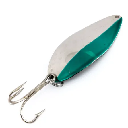 Finishen på detta tunga skeddrag är delad direkt på mitten och kombinerar högglanspolerad nickel med en livfull grön rand. Med en rejäl vikt på 35g (1 1/4 oz) är detta Acme Little Cleo, listad med produktkod 9827, designat för långdistanskast eller för att nå djupa skikt vid trolling. Mässingskroppen på 8cm (3 1/4") har den signifikanta puckelprofilen som har gjort detta USA-tillverkade bete till en stapelvara för lax- och öringfiskare i generationer. På baksidan är namnet "LITTLE CLEO" tydligt stämplat i metallen. Detta specifika exemplar är i utmärkt 5/5-skick med en ljus, reflekterande yta. Det är riggat med en stark trekrok säkrad med en kraftig fjäderring, och nosen är rent borrad för ett beteslås eller direkt knut.