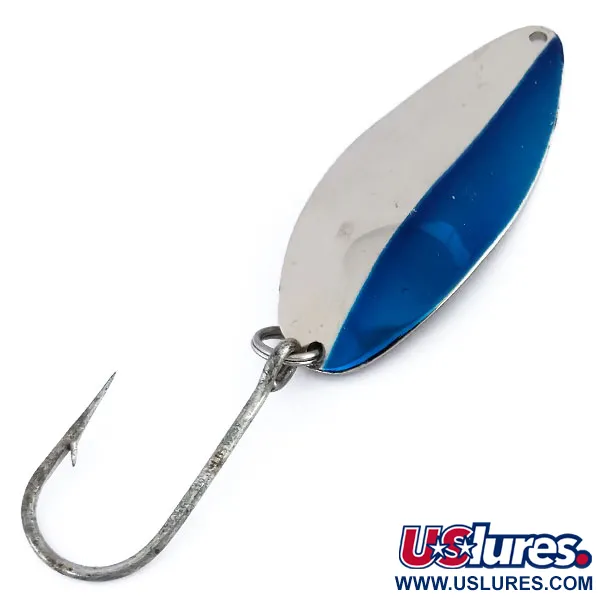 Med en rejäl vikt på 35 g (1 1/4 oz) är denna Acme Little Cleo ett klassiskt amerikanskt skeddrag byggt för långa kast. Draget mäter 8 cm (3 1/4") och framsidan har en karaktäristisk tvåfärgad design där en livfull blå rand kontrasterar mot den polerade nickelbasen. På baksidan är den rena nickelytan tydligt stämplad med namnet "LITTLE CLEO", vilket identifierar dess amerikanska ursprung. Detta exemplar, listat under produktkod 9940, är riggat med en robust enkelkrok säkrad av en kraftig fjäderring. Skicket är graderat till 5/5 och uppvisar en högblank finish och ett knivskarpt målningsarbete över hela metallkroppen.