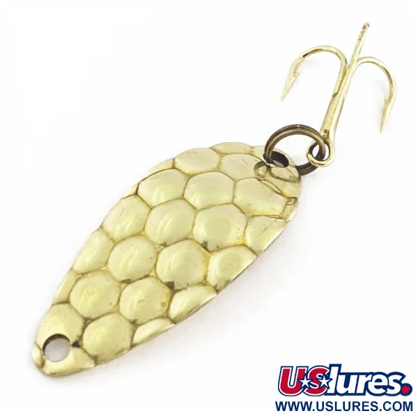 Den hamrade ytan på detta guldpläterade skeddrag skapar en distinkt "bubbeltextur" utformad för att fånga och sprida ljus i alla riktningar. Med en vikt på 1/8 oz (3,5 g) ger den kompakta kroppen på 3 cm en profil som efterliknar små bytesfiskar. Guldpläteringen är anmärkningsvärt ren över den mönstrade sidan, vilket visar på kvaliteten i ytfinish. Den klassiska droppformade silhuetten har en tydlig kurva baktill, vilket ger metallen tillräckligt med tyngd för att kunna fiskas effektivt. Detta exemplar får betyget 5/5 för sin exceptionellt välbevarade utsida. Betecknad med produktkod 24558 utmärker den sig genom det enhetliga mönstret av försänkta gropar på den konvexa sidan.