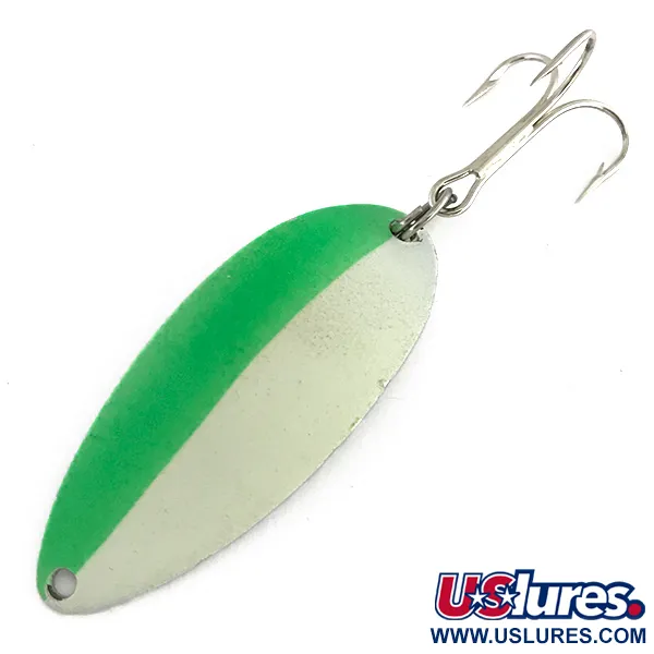 Ett distinkt tvåfärgat mönster i livfullt grönt och självlysande vitt kännetecknar framsidan på detta 5,5 cm (2 1/4") skeddrag. Med en vikt på 11 g (2/5 oz) utnyttjar Acme Little Cleo Glow, produktkod 8435, sin karaktäristiska breda kroppsform med puckelrygg för att flytta vatten vid kast eller trolling. Den vit/grön/nickelfärgade finishen inkluderar en specialiserad Glow in Dark-beläggning på den ljusare halvan, vilket ger en stark lysande signatur i miljöer med svagt ljus. Metallarbetet på detta exemplar, som är stansat i USA, är anmärkningsvärt rent och uppvisar en polerad baksida i nickel som ger en metallisk blänkande effekt vid presentationen. Maskinvaran består av en robust, vass trekrok ansluten med en pålitlig fjäderring. Detta drag är oanvänt och i nyskick, vilket samlare skulle bedöma som 5/5. Färgövergångarna är fortfarande skarpa, utan tecken på åldrande på den självlysande ytan eller den underliggande förnicklingen.