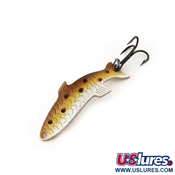 Med en vikt på 1/8 oz (4 g) och en längd på 1 1/2" (4 cm) är detta drag ett utmärkt exempel på amerikansk redskapshistoria. Acme Phoebe har en karakteristisk siluett med en böjd, tredimensionell fiskprofil, här i ett detaljerat Brown Trout / Gold-mönster som efterliknar prickar och fjällstrukturer hos små betesfiskar. På baksidan är det mässingsfärgade metallskalet tydligt präglat med tillverkarens namn och har en ren och blank yta. Detta specifika drag, med produktkod 11454, är i oanvänt skick (betyg 6/5) och visar inga tecken på användning i vatten eller oxidation på krokarna. Det är utrustat med en vass trekrok fäst via en robust fjäderring i stjärten. Den unika hydrodynamiska designen är utvecklad för mångsidighet, vilket gör att det kan fiskas effektivt i både grunda partier och djupare höljor. Dess lockförmåga bygger på metallens naturliga blänk och de målade mönstrens djup för att locka rovfisk under varierande ljusförhållanden.