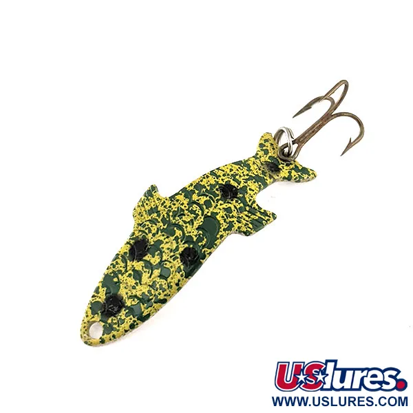 Ett distinkt 'Frog'-mönster bestående av gröna och gula stänk accentuerat med kraftiga svarta fläckar täcker detta exemplar av den böjda metallkroppen. Med en vikt på 1/8 oz (4 g) mäter draget 1 1/2" (4 cm) och har den karakteristiska anatomiska silhuett som gjort Acme Phoebe till en favorit i fiskelådor i decennier. Just detta föremål, identifierat med produktkod 11506, är oanvänt och har kvar sin ursprungliga finish. På den rena, silverfärgade baksidan är namnet 'PHOEBE' tydligt präglat i metallen nära mitten. Monteringen består av en vass, bronsfärgad trekrok säkrad med en pålitlig fjäderring i stjärten. Tack vare sin tredimensionella präglade design uppvisar den en realistisk betesfiskprofil från flera vinklar vid både kast och trolling.