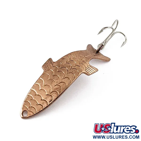 Med en vikt på 7 g (1/4 oz) har detta klassiska skeddrag ett djupt präglat fjällmönster som skapar en tydlig tredimensionell effekt. Draget är tillverkat av Acme i USA och bär namnet ”PHOEBE” tydligt präglat på den släta baksidan. Ytan i solid koppar är blank över hela dess 5 cm (2") längd, vilket ger draget skickbetyget 5/5 tack vare den rena ytan och avsaknaden av synligt slitage. Metallkroppen, med produktkod 17793, är formad som en realistisk fiskprofil med tydliga fenor och en böjd stjärt. En robust trekrok är fäst baktill via en fjäderring, medan ett hål för lininfästning sitter i nosen. Dess hydrodynamiska konstruktion är avsedd för mångsidig användning och fungerar pålitligt oavsett om det vevas in långsamt på grunt vatten eller kastas på djupare vatten.