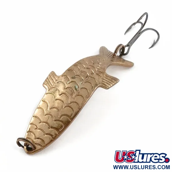 Koppartoner dominerar finishen på detta 7g (1/4 oz) skeddrag i metall, ett kännetecken för Acme Phoebes tidlösa design. Detta exemplar på 5 cm (2"), med produktkod 23908, uppvisar det stansade fjällmönstret som skapar en livstrogen tredimensionell illusion när det rör sig genom vattenpelaren. Tillverkad i USA, har konstruktionen en böjd kroppsform avsedd för presentationer på både djupt och grunt vatten, och den anpassar sig väl till olika invevningshastigheter. Metallytan är ren och välbevarad, vilket ger ett skickbetyg på 5/5. Komponenterna inkluderar en robust fjäderring i nosen och en mörk trekrok vid stjärten. Samlare kommer att uppskatta den tydliga fiskformade stansningen och kopparfärgens värme, som ger ett mer subtilt blänk jämfört med kromade alternativ.