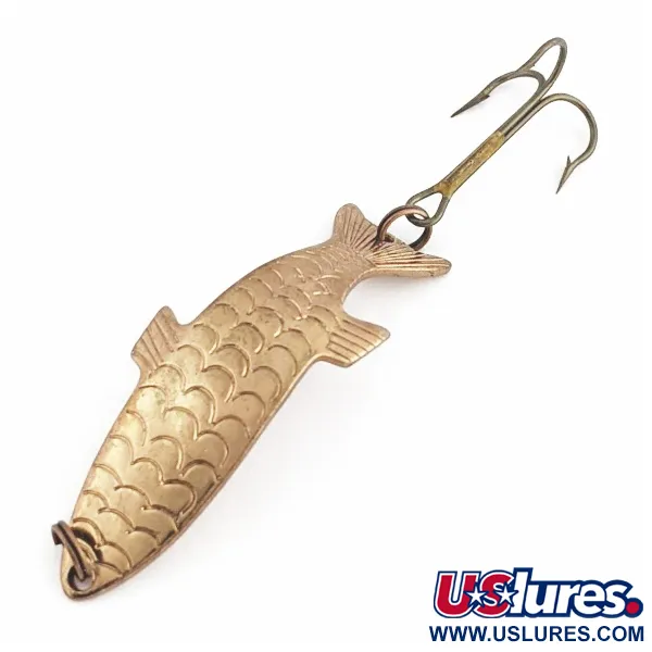 Präglat fjällmönster över metallytan ger en realistisk textur till detta skeddrag på 7 g (1/4 oz). Den böjda kroppen mäter 5 cm (2") och har en detaljerad siluett, komplett med fenor och en avsmalnande stjärtsektion. På baksidan är namnet Phoebe tydligt inpräglat i metallen, vilket markerar dess ursprung från Acme-serien under produktkod #24552. Denna specifika modell med kopparfinish har betyget 5/5 i skick och bibehåller en ren, reflekterande yta över hela draget. Den anatomiska formen, inklusive de utstickande bröst- och ryggfenorna, hjälper till att bibehålla en naturtrogen profil från olika vinklar. En trekrok är fäst baktill genom ett stansat hål i stjärten. Konstruktionen i tung metall är designad för spinnfiske och möjliggör långa kast vid fiske efter öring, abborre eller gös.