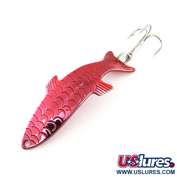 Pink Metallic-plätering täcker den stansade metallkroppen på denna klassiska Acme Phoebe, en design som har varit en stapelvara för sportfiskare i hela USA. Detta bete mäter 2" (5 cm), väger 1/4oz (7 g) och bär produktkod 9153. Framsidan kännetecknas av ett detaljerat fjällmönster och präglade fenor, vilket skapar en tredimensionell illusion vid hemtagning genom vattnet. Dess unika hydrodynamiska form är konstruerad för att fungera på olika djup, oavsett om den fiskas snabbt över grundområden eller långsammare i djupare höljor. På baksidan är tillverkarens namn tydligt stansat i den polerade finishen. Med betyget 5/5 är finishen exceptionellt ren och bibehåller sin högblanka reflekterande kvalitet över hela profilen. Monteringen består av en blank silverfärgad fjäderring och en vass trekrok fäst vid stjärten.