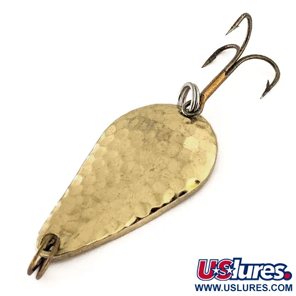 Hamrad guldtextur över den konvexa ytan utgör den främsta visuella lockelsen för detta 14g (1/2oz) skeddrag. Med en längd på 4,5 cm (1 3/4") bär Acme Stee-Lee sin identitet tydligt stämplad i den släta metallen på insidan. Detta exemplar, identifierat med produktkod 11370, har skicket 4/5, då det visar en ljus reflekterande yta på den hamrade sidan och viss lätt mörkning från ålder på de plattare ytorna. Betet är tillverkat i USA och utrustat med robusta fjäderringar i båda ändar och sin ursprungliga bronserade trekrok. Droppformen är ett signum för denna serie, designad för effektiva kastavstånd på olika djup. Den stämplade märkningen förblir skarp och fullt läsbar mot den guldtonade finishen.