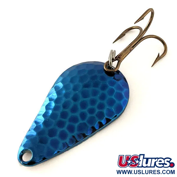 En hamrad blå finish täcker framsidan på detta 1/2oz (14g) skeddrag, vilket ger en texturerad yta som reflekterar ljus under vattnet. På baksidan finns en polerad nickelyta stämplad med det klassiska namnet Stee-Lee. Denna Acme-modell har produktkod 12075, mäter 4,5 cm (1 3/4") och är i oanvänt skick. Tillverkad i USA och utrustad med en kraftig trekrok i brons samt en stark fjäderring i stjärten. Den droppformade profilen är viktad för långa kast, vilket gör den till ett pålitligt val för fiske från land eller för att nå djupare vattenlager från båt. Det finns ett rent stansat hål i huvudet, redo för direkt knut eller ett beteslås.