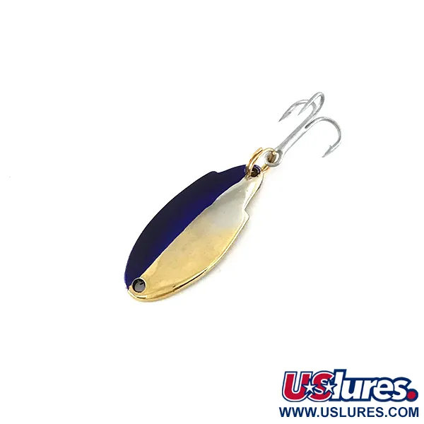 Slående tvåfärgad Nickel och Blå färgsättning definierar denna klassiska Acme Thunderbolt, en design inriktad på öring och abborrfiskar. Med en längd på 1 1/4" (3 cm) och en vikt på 1/8 oz (3,5 g) bär detta skeddrag produktkod 8365 och representerar amerikansk tillverkning från mitten av århundradet. Medan den officiella katalogen anger vikten till 1/8 oz (3,5 g), är kroppen stämplad med 1/10 oz, en vanlig detalj på dessa pressade plåtdrag som uppskattas av samlare. En högblank nickelfinish täcker buken, medan ovansidan har en tydlig uppdelning mellan den polerade metallen och djupblå färg. Monteringen består av en robust fjäderring och en vass trekrok, allt i originalskick med betyget 5/5. Det blå pigmentet täcker ungefär hälften av den övre ytan, vilket skapar ett distinkt visuellt avbrott mot det polerade nicklet.