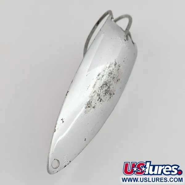 Tydligt präglat på skedens undersida finns orden "ACME WEEDLESS MINNOW", ett bevis på en design som patenterades redan 1951. Den affärsmässiga änden har en unik trippelkroksmekanism utformad för att förbli vasskyddad tills en fisk hugger, vilket får krokarna att fällas ut. Glänsande med en klassisk kromfinish visar detta exemplar mindre ytspår från sin tid i en fiskelåda, vilket ger ett skickbetyg på 4/5. Med en längd på 3" (7,5 cm) och en vikt på 3/4 oz (24 g) är den tillräckligt tung för långa, exakta kast i tät vegetation eller näckrosor. Skedens inre kurva bär också markeringen "PAT. PENDING", vilket placerar den i den tidiga tillverkningshistorien för denna amerikanska klassiker. För bästa resultat vevar erfarna sportfiskare hem dessa långsamt genom tätt gräs eller ökar tempot i öppna luckor.