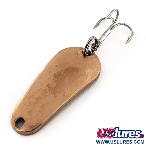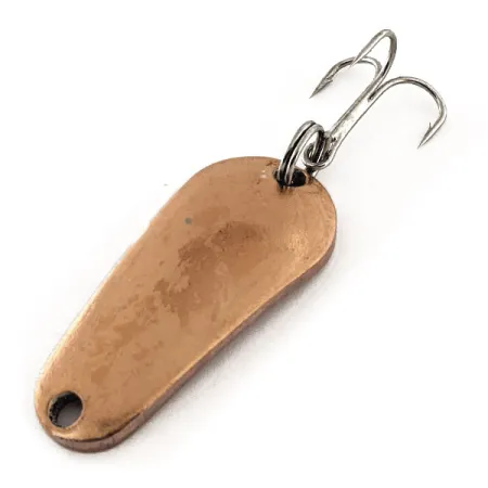 En varm kopparfinish definierar detta klassiska amerikanska skeddrag, som reflekterar ljuset med den mjuka lyster som är typisk för vintage-beten i metall. Tillverkat av Aeroplane Spinner i USA, representerar denna Aero-modell (Produktkod: 11796) en period av enkel och effektiv redskapsdesign. Med en vikt på 7 g (1/4 oz) och en längd på 3,7 cm (1 1/2") är dess droppformade profil stansad med en subtil böjning för att skapa rätt gång i vattnet. Exemplaret är oanvänt och i skick 5/5, med en ren yta helt utan slitage. Det är utrustat med en silverfärgad fjäderring och en vass trekrok, som ger en fin kontrast mot kopparkroppens rika, rödguldiga ton.