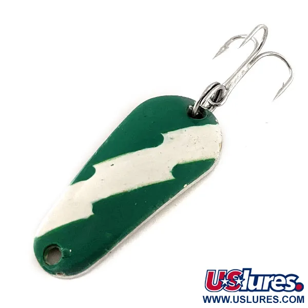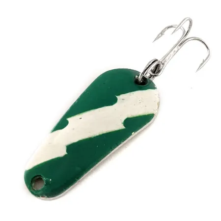 Tydligt präglat på den polerade guld-baksidan finns namnet Aero och vikten, vilket identifierar detta klassiska amerikansktillverkade skeddrag från företaget Aeroplane Spinner. Med en längd på 3,7 cm (1 1/2") har betet en slående emaljfinish på den konvexa sidan där en sicksackformad vit rand delar ett djupgrönt fält. Detta specifika exemplar, identifierat med produktkod 11803, är i utmärkt 5/5-skick med originalfärgen kvar i skarpt och levande skick. En vass silverfärgad trekrok är fäst på baksidan via en robust fjäderring, redo för kastfiske eller lätt trolling. Vikten på 7 g (1/4 oz) ger tillräcklig massa för riktade kast under olika vattenförhållanden. Den mässingstonade metallen på baksidan fungerar som en högkontrastblixt mot den målade ovansidan.
