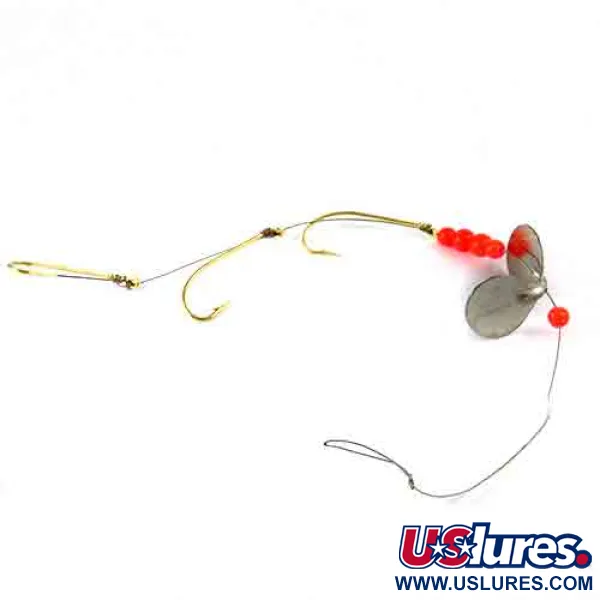 Guldtonade krokar tillsammans med livfulla röda pärlor definierar den visuella profilen för detta klassiska amerikansktillverkade tackel. Med en total längd på 20 cm (7 3/4") har uppsättningen en förnicklad dubbelbladig propellerspinnare tydligt stämplad med "3 AERO SPIN" på ytan. Med en lätt vikt på 1/8 oz (4 g) är hårdvaran monterad på en flexibel wire-tafs, som ofta används för trolling eller kastfiske. Aeroplane Spinner-företaget använde en specifik Aero spin 3-design som innehåller en serie av sex klarröda pärlor för att ge visuell kontrast mot bladens metalliska nickelfinish. Med produktkod 2992 är detta exemplar i imponerande skick, betygsatt 5/5 för sina välskötta ytor och vassa krokspetsar. De guldfärgade krokarna är strategiskt placerade längs linan för att passa olika agntekniker.
