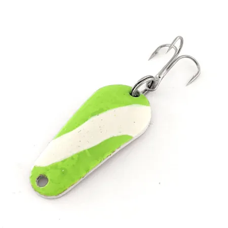 7 gram (1/4oz) amerikansk sportfiskehistoria – detta skeddrag kännetecknas av en distinkt hamrad textur över metallkroppen. Tillverkat av Aeroplane Spinner under namnet Aero UV, är detta 3,7 cm (1 1/2") långa bete utrustat med en vass trekrok och en stark fjäderring i aktern. Färgsättningen består av diagonala band i fluorescerande grönt och vitt ovanpå en kopparbas. Vid dagsljus ser det ut som ett vanligt färgstarkt bete, men "UV Glow" syftar på dess förmåga att lysa upp under ultraviolett ljus, vilket gör det extremt synligt i djupt eller grumligt vatten. Betet har betyget 5/5 och är i utmärkt skick med bevarade färger och rena komponenter. Med produktkod 11529 är detta en mångsidig storlek för olika sötvattensarter. Ett litet fästhål är precisionsborrat i den smala änden för beteslås eller tafs.