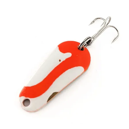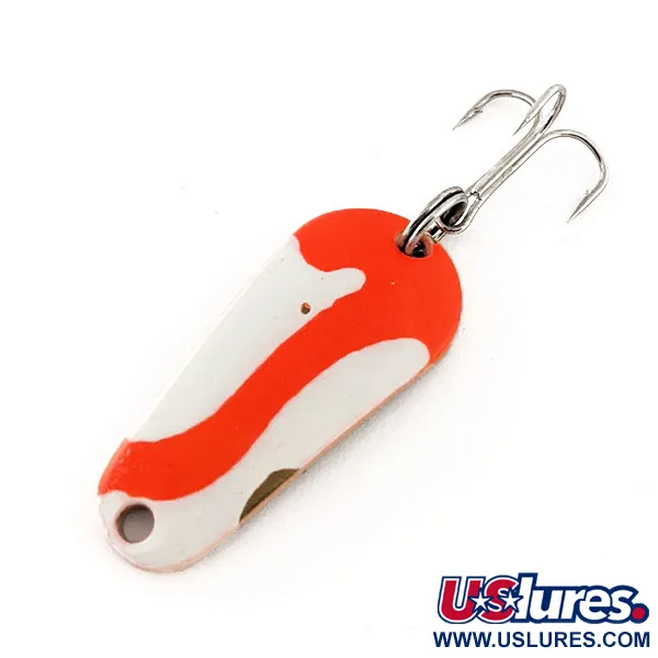 En iögonfallande våg av fluorescerande orange sträcker sig över framsidan på detta USA-tillverkade skeddrag, vilket ger hög synlighet i grumliga vattenförhållanden. Aeroplane Spinner Aero UV, katalogiserad med produktkod 11537, mäter 4 cm (1 1/2") och väger 7 g (1/4oz). Färgmönstret består av en ren vit bas med en kraftig orange rand, vilket låter den ursprungliga guldpläteringen synas vid den nedre kanten. Under UV-ljus reagerar det orangea pigmentet intensivt, en specifik teknisk egenskap avsedd för presentationer på djupt vatten eller under mulna dagar när ljusinsläppet är minimalt. Draget är utrustat med en standard trekrok fäst via en fjäderring i aktern. Vid inspektion ser man att färgen har skarpa, tydliga gränser och metallkomponenterna är exceptionellt rena, vilket återspeglar ett skick på 5/5. Aeroplane Spinner använde dessa slitstarka ytbehandlingar för att säkerställa hållbarhet genom säsonger av spinnfiske och jigging.