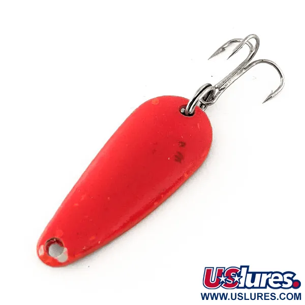 Med en vikt på 9g har Aero UV-skeddraget en specialiserad fluorescerande beläggning som reagerar starkt under ultraviolett ljus. Detta exemplar från Aeroplane Spinner, med produktkod 11620, har en livlig Rosa / Guld-finish designad för synlighet i djupt eller grumligt vatten. Den droppformade kroppen mäter 4 cm och är utrustad med en silverfärgad trekrok monterad via en kraftig fjäderring. Detta bete är tillverkat i USA och representerar den klassiska designen för skeddrag med fästpunkt i den smala änden. Den målade ytan är i utmärkt skick och får betyget 5/5 för sin välbevarade, ljusa finish. På baksidan ger den metalliska guldbasen en traditionell blixt som kompletterar den högvisuella fluorescerande framsidan.