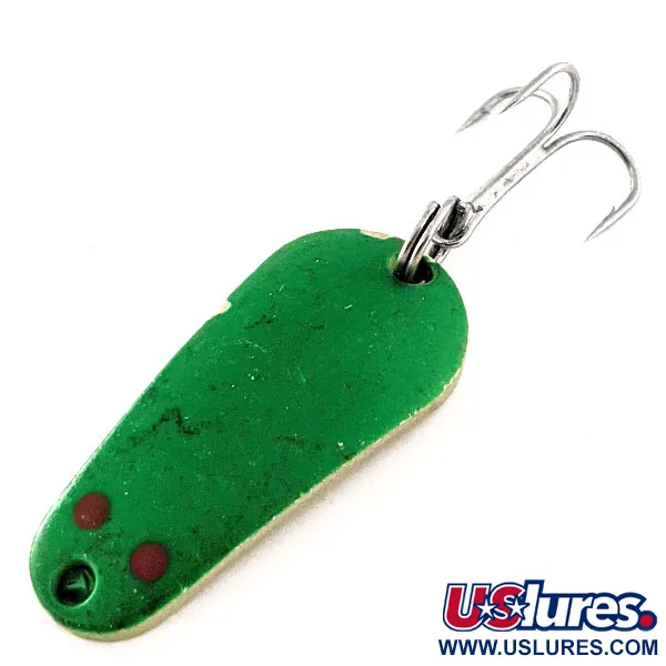 Detta kompakta skeddrag från Aeroplane Spinner mäter exakt 1 1/2" (3,7 cm) och har en livfull grön finish på framsidan med två distinkta röda prickar nära linfästet. Med en vikt på 1/4 oz (7 g) är vikten koncentrerad för exakta kast i olika vattenförhållanden. Baksidan har en ren guldfinish som ger en klassisk kontrast till den gröna huvudfärgen. Under ultraviolett ljus visar "Aero UV"-beläggningen (produktkod 11792) sin specialiserade natur genom att glöda intensivt, en taktisk fördel i djupare eller grumliga vatten. Komponenterna består av en enda vass trekrok säkrad med en fjäderring, vilket visar den funktionsfokuserade design som är vanlig i USA-tillverkad utrustning. Detta exemplar är i exceptionellt 5/5-skick och behåller sin ursprungliga lyster på både målade och metalliska ytor.