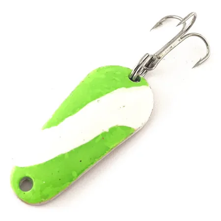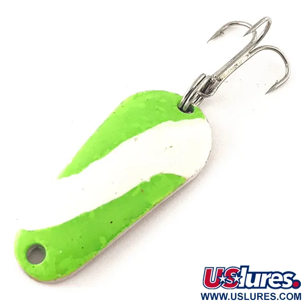 En kopparbas döljs under en djärv grön och vit fluorescerande ovansida på detta amerikansktillverkade skeddrag. Med en längd på 3,7 cm (1 1/2") är betet utformat för hög synlighet, särskilt då färgen reagerar starkt under UV-ljus och avslöjar en lysande signatur. Detta Aeroplane Spinner-exemplar, med produktkod 12054, väger 7 g (1/4oz), vilket ger tillräcklig tyngd för exakt placering i vattenpelaren. Finishen är i fantastiskt skick (5/5) och det vågiga mönstret är skarpt och intakt. En enkel fjäderring ansluter en vass trekrok till baksidan av draget. Den avsmalnande profilen ger en stabil gång vid jiggning eller ett rytmiskt blänk vid invidning genom vattnet.