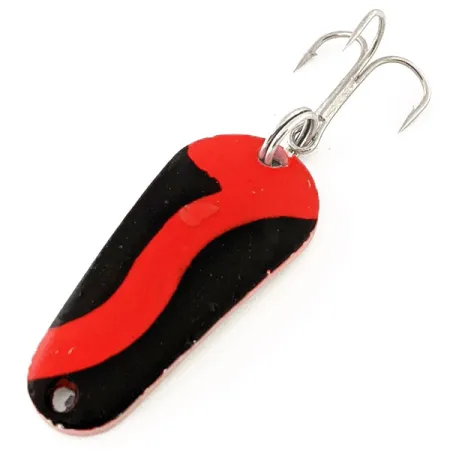 Utrustad med ett djärvt svart och rött vågmönster över en guldbas, uppvisar detta drag den klassiska Aeroplane Spinner-estetiken. Aero UV, som har sitt ursprung i USA, har en specialiserad fluorescerande beläggning som reagerar kraftigt under ultraviolett ljus. Med en mångsidig vikt på 7 g (1/4 oz) och en längd på 3,7 cm (1 1/2"), representerar den en standardprofil för kastfiske efter olika sötvattensarter. Trekroken är säkert fäst via en robust fjäderring, vilket säkerställer att hårdvaran är lika pålitlig som när den tillverkades. Detta specifika exemplar, katalogiserat under kod 12055, håller skicket 5/5 med en ren finish och klara färger. Kontrasten mellan det djupa svarta och den glödande röd-orangea randen ger en tydlig visuell signatur för miljöer med svagt ljus.
