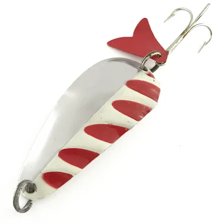 Registrerad 1956, den distinkta vågiga kanten på detta kanadensisktillverkade AL&W Half Wave ger en strukturell profil som sällan skådas på moderna beten. Detta specifika exemplar, med produktkod 6652, väger 2/3 oz (19 g) och mäter 2 3/4" (7 cm). Framsidan har ett skarpt mönster av snedställda röda fält över en vit bas, där den ursprungliga nickelytan är exponerad på bladets övre del. På baksidan är den polerade ytan tydligt stämplad med AL&W Tackle-logotypen och registreringsdatumet för designen. En genomskinlig röd plaststjärt är monterad på den bakre fjäderringen för att fungera som en visuell huggpunkt precis ovanför den ursprungliga trekroken. Betets skick är 5/5, vilket visar på en mycket hög bevarandegrad på både målade och metalliska ytor. Två robusta fjäderringar vid linögla och krokfäste tyder på att detta skeddrag byggdes för hållbarhet vid kastfiske eller trolling.