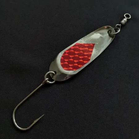 Röd prismatejp ger en högkontrasterande huggpunkt mot den förnicklade kroppen på denna klassiker på 7g (1/4oz). Med en längd på exakt 6 cm (2 1/4"), representerar detta Andy Reekers-skeddrag en gyllene era av amerikansk redskapstillverkning från västkusten. Monteringen inkluderar en stor enkelkrok säkrad med en robust fjäderring och ett färdigmonterat lekande för att motverka linvridning. Betet bär produktkod 20373 och har ett välvårdat utseende med skickgradering 4/5, vilket innebär endast lätta spår av sin vintagehistorik. Den avlånga, slanka profilen är typisk för skeddrag designade för mångsidigt spinnfiske eller trolling.