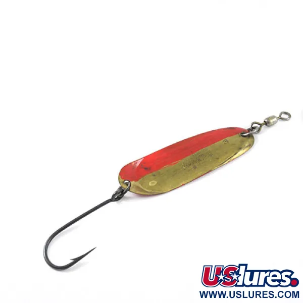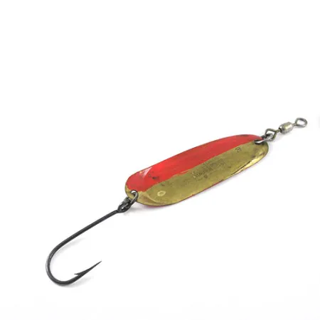 Inpräglat på mässingskroppen på detta skeddrag på 4,5 g (3/16 oz) finns patentdatum som sträcker sig tillbaka till 1920-talet, specifikt 16 oktober 1923 och 2 februari 1926. Andy Reekers 3 mäter 5,0 cm (2") och är ett klassiskt amerikanskt trollingbete designat för stabil gång i vattenpelaren. Ursprungsfinishen är mässing, men en röd rand har applicerats på ena halvan av skeden – en vanlig modifiering som sportfiskare gör för att skapa hög kontrast och synlighet. Skedens bakre del är tydligt stämplad med storlek 3 precis ovanför fjäderringen. Draget är utrustat med enkelkrok och en toppmonterad lekare, och visar tydlig karaktär från sin tid i en fiskelåda med ett skickbetyg på 3/5. Konstruktionen speglar den robusta tillverkning som var typisk för amerikansk fiskeutrustning från mitten av seklet, främst avsedd för trolling i både söt- och saltvatten.