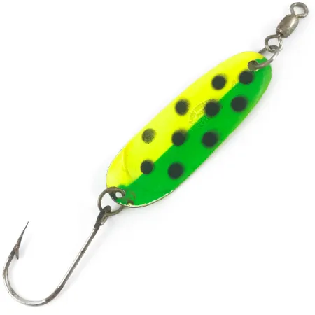Detta klassiska skeddrag för trolling mäter exakt 6 cm i längd och har en djärv finish med hög kontrast som är utformad för maximal synlighet. Denna Andy Reekers UV-modell väger 7 g och uppvisar en distinkt framsida som är vertikalt delad mellan klargult och levande grönt, punkterad av en serie stora svarta prickar. Baksidan av draget är lackerad med en enfärgad gul UV-reaktiv beläggning, ett tekniskt val avsett för djuptrolling där ljusinsläppet är begränsat. Draget är redo för omedelbar användning och inkluderar en stor enkelkrok samt ett toppmonterat lekande, sammankopplade med robusta fjäderringar. Tillverkat i USA under produktkod 4691; nickelbasen ger en hållbar grund för lackeringen. Detta exemplar är i utmärkt 5/5 skick och uppvisar en välbevarad yta som är typisk för ett vintagefynd av hög kvalitet. Färgen förblir levande över den stansade metallkroppen, vilket är ett kännetecken för Reekers design för lax- och öringfiskare.