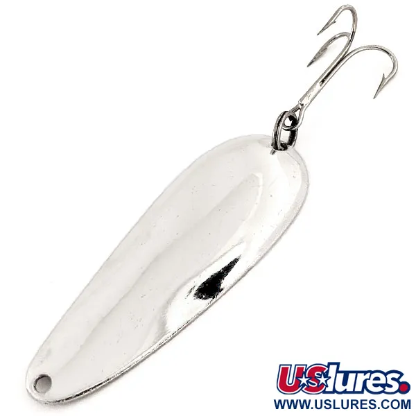 Med en vikt på exakt 1/2 oz (14 g) har denna klassiska del av amerikansk sportfiskehistoria en blank nickelyta som förblir anmärkningsvärt klar. Den droppformade kroppen mäter 2 3/4" (7 cm) och har kvar originaldetaljerna från fabriken, inklusive en robust fjäderring och en vass trekrok i akteränden. På den konkava sidan är Aqua Spoon tydligt stämplad med sitt namn och "MADE IN U.S.A.", en detalj som ofta eftersöks av de som dokumenterar Nebcos produktion från mitten av århundradet. Detta exemplar, med produktkod 12969, är i 5/5-skick och uppvisar en högreflekterande yta och rena kanter. Den enkla, funktionella designen på detta skeddrag framhäver erans raka tillverkningsstandarder.